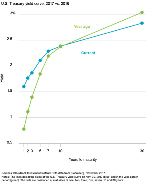 La courbe des emprunts d’État américains s’est aplatie pendant la majeure partie de l’année 2017, et les spreads entre les taux longs et courts ont récemment atteint leur niveau le plus bas depuis des décennies. Il s’agit habituellement d’un phénomène caractéristique d’une fin de cycle et annonciateur d’un essoufflement de la croissance, mais pas cette fois d’après nous.
