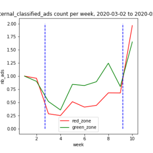 D’après les résultats de l’étude, le confinement a eu un impact plus faible sur le marché locatif en zone verte qu’en zone rouge. En effet, un nombre important d’annonces sont restées publiées en zone verte alors que le nombre a été bien plus faible en zone rouge. Cependant la reprise s’avère intense en zone rouge avec un nombre d’annonce moyen deux vois plus important que la semaine qui précède le confinement.