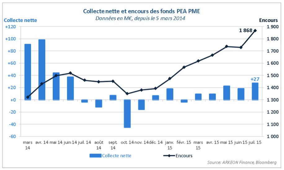 ARKEON Finance a publié son étude mensuelle sur les encours et la collecte des fonds éligibles au PEA-PME pour le mois de juillet. Lors de ce mois, les 64 fonds éligibles au PEA-PME ont collecté +27 M€ (collecte nette, ajustée de l’effet marché). Les encours des fonds ont atteint 1868 M€ en fin de mois.