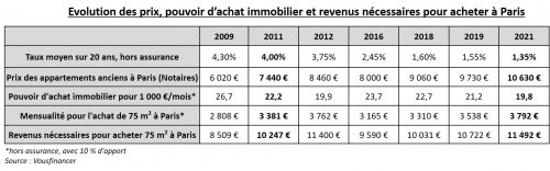 Pour autant sur 10 ans, la hausse des prix à Paris est de 42 % au total et même de 77 % par rapport au point bas de 2009, où le prix moyen était descendu à 6 020 €/m2. A cette période-là, les taux de crédit étaient à plus de 4 % sur 20 ans. Depuis, même s’ils ont été divisés par 3, l’envolée des prix à Paris n’est plus compensée par la baisse des taux, et le pouvoir d’achat immobilier ne cesse de diminuer depuis 2016, passant pour 1000 € de mensualité sur 20 ans, de 23,7 m2 à 19,8 m2 actuellement « En termes de pouvoir d’achat immobilier, entre 2012 et 2017 la hausse des prix à Paris était compensée par le niveau des taux. Mais ce n’est plus le cas depuis que les prix ont passé le seuil symbolique des 9 000 € le m2 début 2018. A plus de 10 500 €, on ne peut désormais même plus acheter 20 m2 avec des taux à 1,35 %, contre plus de 22 m2 il y a 10 ans, avec des taux pourtant à 4 %, mais des prix 40 % plus bas… » analyse Sandrine Allonier, directrice des études de Vousfinancer.