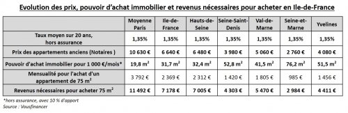 Coté revenus, de gros écarts également : pour acheter 75 m2 dans les Hauts-de-Seine, il faut gagner 7000 € par mois contre 4300 € en Seine-Saint-Denis mais davantage dans les Yvelines (4411 €). On est dans tous les cas bien loin des 11 500 €/mois nécessaires pour acheter à Paris…