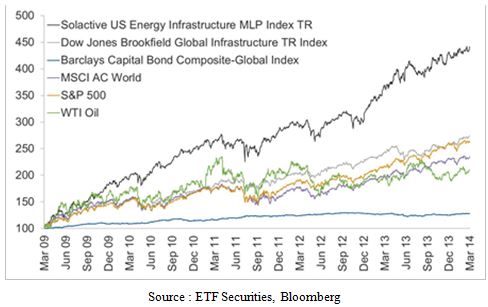 MLPs have outperformed major equity and bond benchmarks over the past 5 years, posting an annual return of 34% compared to 21% for the S&P 500, 18% for the MSCI World and 5% for the Barclays global bond index.