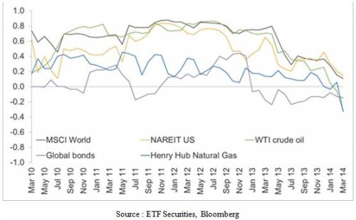 Although MLPs’ correlation to equities and commodities reached an elevated level between 2009 and 2013, these numbers have started to decline over the past year, recently standing around -0.1 on average. “MLPs’ low correlation to bonds and other asset classes may provide useful diversification benefits” suggests Henry Boua.