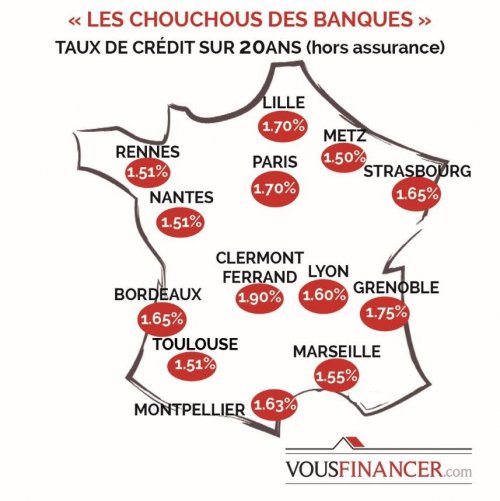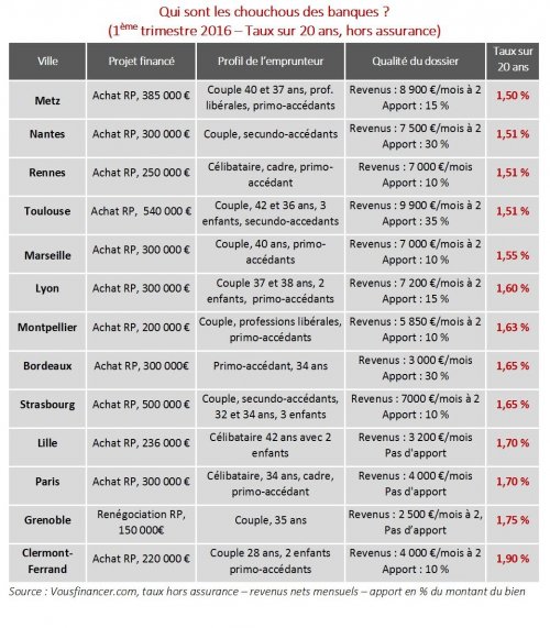 Dans cette nouvelle édition du Baromètre Vousfinancer.com des « Chouchous des banques », grâce aux récentes baisses, les taux de crédit atteignent de nouveaux records historiques, notamment pour les meilleurs profils qui empruntent ainsi à 1,50 % sur 20 ans à Metz, Nantes, Rennes ou Toulouse, contre 1,64 % au mieux en mai 2015 à Grenoble ou à Lyon. « Par rapport au mois de mai 2015 au moment où les taux étaient descendus à un premier plancher, nous parvenons à obtenir des taux inférieurs de 0,15 % pouvant atteindre au mieux 1,3 % sur 15 ans, 1,50 % sur 20 ans et 1,95 % sur 25 ans ! Ces niveaux de taux inédits que proposent essentiellement des banques régionales s’inscrivent dans un contexte de forte concurrence entre les banques qui cherchent ainsi à capter une clientèle à fort potentiel avec des revenus élevés permettant la mise en place d’une relation bancaire sur le long terme » constate Sandrine Allonier, directrice des relations banques de Vousfinancer.com.
