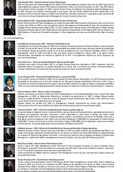 A compter du 30 septembre 2015, les capacités de gestion seront donc assurées par CPR AM. Le nouveau pôle de gestion actions thématiques, sous la responsabilité de Vafa Ahmadi, nommé directeur de la gestion thématique et d’Estelle Ménard, nommée responsable adjointe, se voit confier un actif sous gestion de plus de 3.6 milliards d’euros. L’équipe compte 10 professionnels de l’investissement qui, avec l’appui de l’ensemble des équipes de CPR AM, sera en charge d’assurer la pérennité et le développement des expertises thématiques existantes et à venir pour le Groupe. Le partage de ces « best practice » et savoir-faire permet d’optimiser et d’enrichir cette capacité avérée de gestion performante.