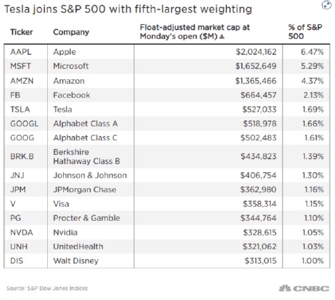 Le 21 décembre 2020, Tesla est entrée dans l’indice S&P 500 en cinquième position avec un poids de 1.7%. Mais entrer dans cet indice n’a pas été facile pour Tesla, qui jusqu’à récemment remplissait pourtant la plupart des critères pour y entrer. Une entreprise doit être suffisamment grande pour mériter d’être incluse (plus de 8,2 milliards de dollars de capitalisation boursière), être suffisamment rentable (quatre trimestres consécutifs de profit), avoir suffisamment de flottant et répondre à certains critères de gouvernance d’entreprise. Tesla a répondu à ces critères en juillet et est depuis longtemps une énorme entreprise. Sa capitalisation boursière est de plus de 500 milliards de dollars à son entrée.
