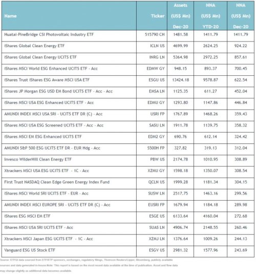 Top 20 ESG ETFs/ETPs by net new assets December 2020