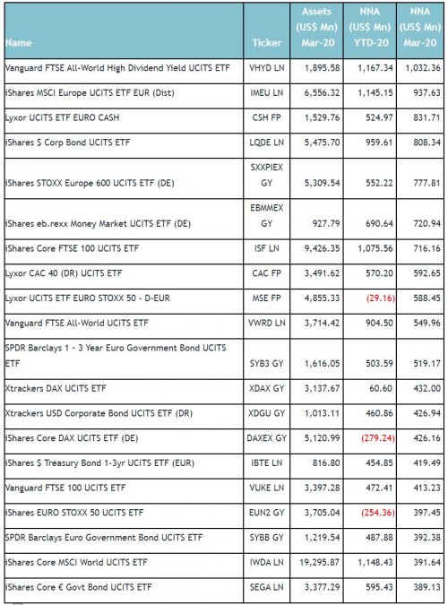 Substantial inflows can be attributed to the top 20 ETFs by net new assets, which collectively gathered $11.76 billion at the end of March. The Vanguard FTSE All-World High Dividend Yield UCITS ETF (VHYD LN)gathered $1.03 billion alone.