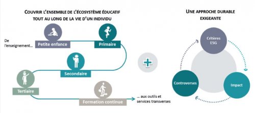 Nous avons articulé l’univers autour de 3 piliers. Un pilier central autour de l’accès à l’éducation et au monde du travail qui inclut les écoles, collèges, lycées et universités cotées ainsi que la formation continue, et les agences de recrutement et de gestion des talents.