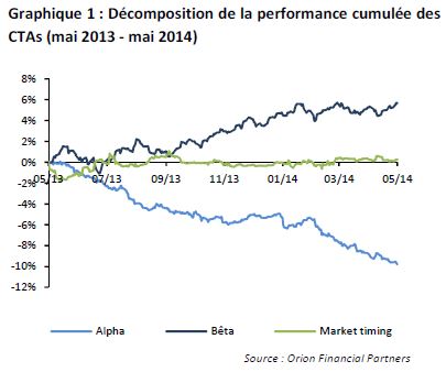 Le graphique 1 résume les résultats issus de l’analyse quantitative des performances de l’indice HFRX Macro Systematic CTA depuis mai 2013 [1]. En premier lieu, nous constatons les expositions moyennes aux risques de marché (bêta) ont généré une performance significative en 2013, mais plus depuis le début de l’année.