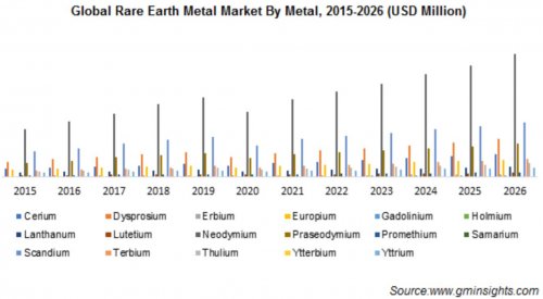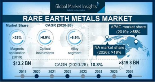 La taille du marché des métaux des terres rares était évaluée à environ 13,2 milliards de dollars en 2019 et affichera un taux de croissance annuel moyen de plus de 10,7 % entre 2020 et 2026.