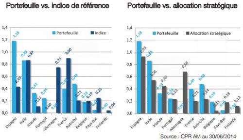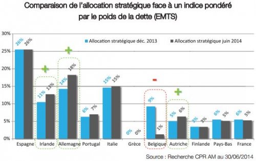 A la suite du rebalancement semestriel fin juin, la nouvelle allocation stratégique a conduit à une baisse sensible du poids de la Belgique (1% contre 9% fin décembre 2013) au profit notamment de l’Allemagne (18% contre 14% précédemment) et de l’Irlande (13% contre 11%). La Belgique est rétrogradée sur le critère des réformes engagées en raison d’une situation politique intérieure complexe puisque le gouvernement n’est toujours pas formé. En comparaison d’un indice pondéré par le poids de la dette (EMTS, capi weighted), notre stratégie privilégie les pays périphériques (60% contre 40% pour l’indice) avec une surpondération de l’Espagne (25% contre 12% l’indice) et une sous-pondération de l’Italie (15%, soit 8% de moins que l’indice). Sur les pays « core » qui représentent 40% (contre 60% pour l’indice), l’Allemagne a un poids proche de l’indice (18%) tandis que la France ne pèse que 5% contre 23% dans l’indice.