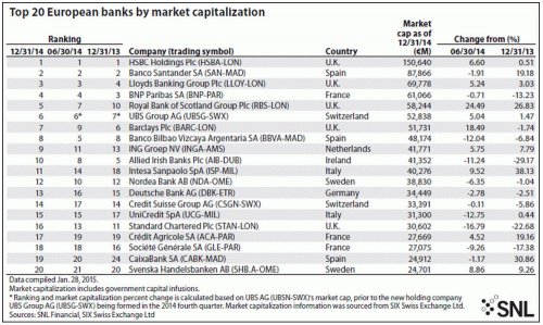 SNL Financial: HSBC remains firmly atop European bank market cap ranking