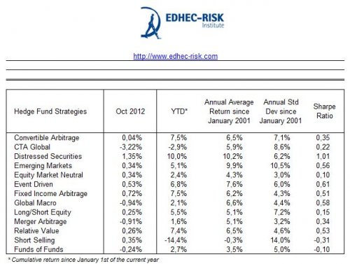 "In October, stocks experienced a setback (S&P 500: -1.85%), with implied volatility increasing slightly (VIX: 18.6%). High-grade bonds were nearly flat (Lehman Global: -0.17%, Lehman US: -0.06%), risky credit remained strong (credit-spread index: 1.00%) extending its winning streak to 5 months whereas the convertible bonds’ rally was interrupted by a (-0.56%) loss. Commodities fell significantly (-4.20%) while the US dollar bounced back marginally (0.60%).