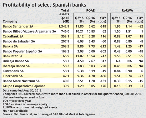 Only three of Spain’s top 13 banks reported a year-on-year rise in net interest income in the second quarter, and at least seven saw net interest margin fall. Only Banco Bilbao Vizcaya Argentaria SA (BBVA) and Bankinter SA reported double-digit returns on average equity.