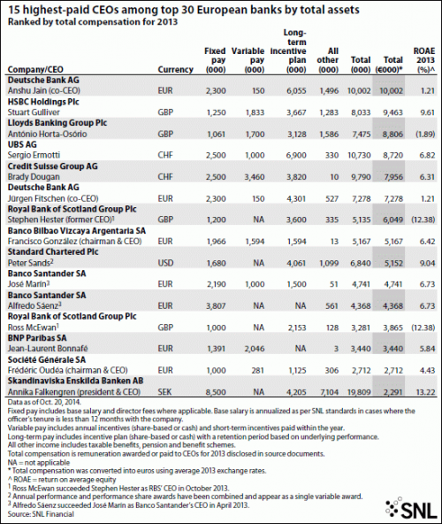 But comfortably ahead in the number one spot is Deutsche Bank AG’s Anshu Jain, who received a pay package amounting to €10.0 million in 2013, including a €6.1 million long-term incentive plan, despite the bank only recording an ROAE of 1.21%. His co-CEO, Jürgen Fitschen, received €7.3 million of total pay.