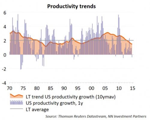 An increasingly hotly debated topic with respect to the medium-term outlook for both the economy and markets is the increasing signs of a trend fall-back in productivity growth in DM economies. Shortly put, lower productivity growth leads to lower economic growth, increased solvency risks in entitlement (social security, health and pension) schemes, less earnings growth potential, a higher risk of “secular stagnation”, lower interest rates (for even longer) and limited room for a further compression in risk premiums in financial markets. For investors the medium-term consequence of weak productivity growth is therefore very straightforward as it creates less investment opportunities, lower return expectations and more systemic risks. Not really something to look forward to.