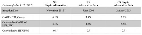 (note: we subadvise this one), NN Alternative Beta and Credit Suisse Liquid Alternative Beta. Each has