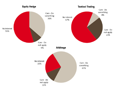 Small and large firms also diverged in their approach to ESG. Whilst the survey showed that large firms are more likely to have in place a formal ESG policy than smaller firms, there are again exceptions. Arrowgrass Capital Partners has USD 5.9bn under management and has a strong ESG policy having partnered with an ESG data provider and a responsible investment consultant, and having its CEO and other members of the senior executive sitting on its ESG committee.