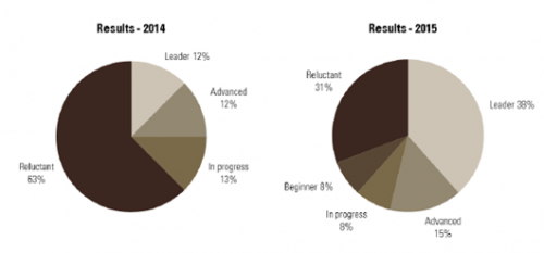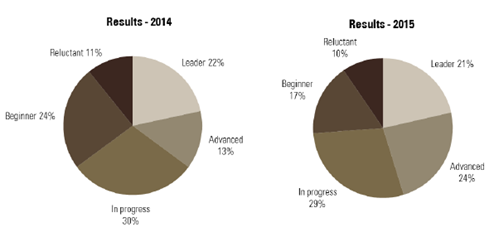 Private equity managers are on the whole more advanced than their hedge fund counterparts in ESG adoption, and Unigestion has also seen a larger year on year improvement in this asset class. This year, 42% of private equity managers achieved ‘advanced’ or ‘leader’ status (up from 29% last year) and the proportion of ‘reluctant’ managers fell from 27% to 21%.