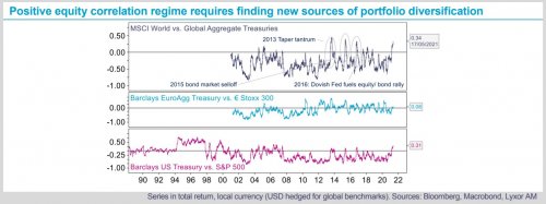 With bond yields facing upward pressures as the global economy heats up, finding diversification across traditional asset classes has been increasingly difficult. Equity valuations, which were propelled by low interest rates in the past decade, are vulnerable in the face of rising bond yields. Traditional equity/ bond portfolios are not as diversified as they had been. We estimate the global equity/ bond correlation has turned positive early March and continued to rise to 0.34 at present, a record since 2016. A positive correlation regime between equities and bonds is not necessarily a bad thing. In the late ‘90s, returns were positively correlated for years because both asset classes were rising. In the past decade, shifts in correlation regimes were short lived, but have the potential to cause substantial pain for investors. At this stage of the business cycle we are monitoring the extent to which a rise in bond yields would hurt equities and the fact there are not so many alternatives to fixed income to protect portfolios.
