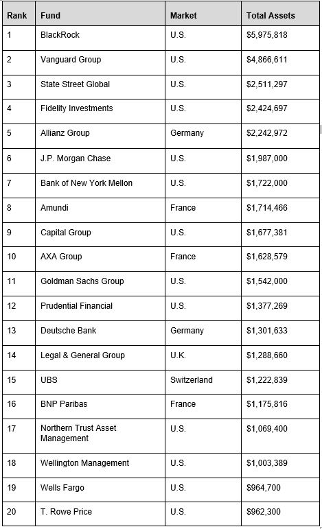 The World’s largest Money managers Ranked by total assets under management, in U.S. millions, as of Dec. 31,2018