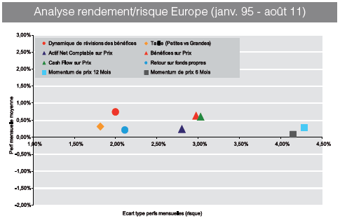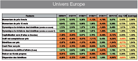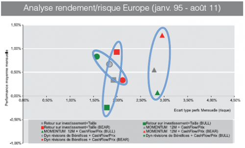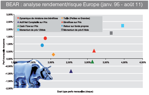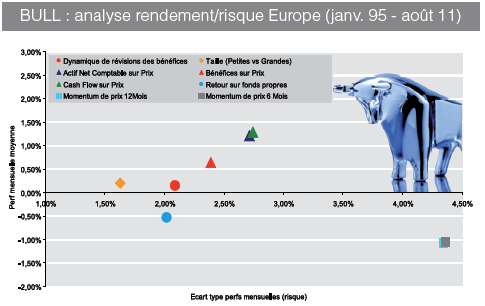 In a "Bull" market, the analysis changes: it is the discount factors (cash flow and price ratio and net asset value and price ratio) that offer the best risk / return. We also note that the price momentum factors must be avoided because of their inefficiency and high risk.