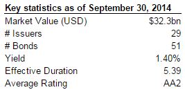 The index has daily historical data back to its chosen inception date of December 31, 2010. Initially, the index would have been dominated by AAA-rated supranational issuers. The first qualifying green corporate constituent did not arrive until 2013. But in 2014, corporate issuers have contributed equally to the growth of the index and now make up a third of the index capitalization, improving the diversity of the index and also adding incremental spread, as the average rating has declined to AA2 with the addition of the corporates.