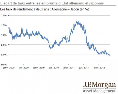 Compte tenu de l’ampleur des opérations de refinancement à long terme de la BCE, il y a une demande massive de collatéral adossé à des obligations de court terme. Cela a tiré les taux d’intérêt vers le bas en deçà des niveaux d’équilibre. Notre graphique montre le différentiel entre les taux d’intérêt à deux ans allemand et japonais et le décalage qui s’est récemment produit.