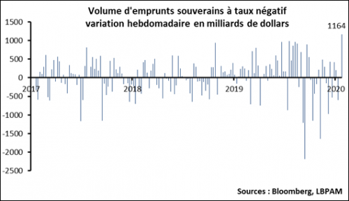 Conséquence, le volume de dette en taux négatif est reparti rapidement à la hausse. Des données hebdomadaires sur le montant de dette en taux négatif sont disponibles depuis 2017, la variation hebdomadaire de la semaine passée est la plus forte jamais enregistrée avec plus de 1 000 milliards d’augmentation.