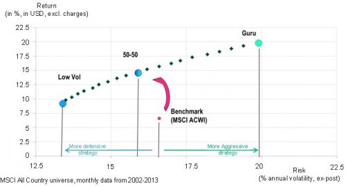 Here is a simple and practical example of how to apply this philosophy based on existing and completely transparent smart beta “low volatility” and “guru” strategies applied to a global universe of developed and emerging country equities.