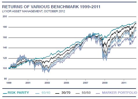 The performance analysis of a risk parity strategy allocating amongst equity and fixed-income of developed countries using various benchmark is a case in point. For the period 1999-2011, benchmarked against the 60/40 portfolio, the annualized alpha and the tracking error volatility of this risk parity strategy come at 72 bps and 7.80%, with an information ratio at 9.2%. Benchmarked against a 30/70 portfolio, which is more representative of the traditional portfolio of large institutional investors in the eurozone, the same information ratio is 5.4%. By now, it should be obvious that a 50/50 would also result in a different information ratio. In order to avoid these arbitrary choices of benchmark, the most rational choice is to use the market portfolio. In this case, the information ratio is equal to 17.75%, highlighting the value created by this risk parity strategy.