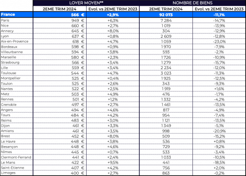 En moyenne, les loyers des studios ont progressé de +2,9% en 1 an, mais cette tendance cache des disparités. En tête des villes principales dans lesquelles le budget mensuel pour un studio a le plus progressé, on note Le Mans à +9,5% par rapport au 2ème trimestre 2023, suivi de Brest et Annecy à +8,0%, et bien entendu Paris, à +6,3%. À l’inverse, c’est à Montpellier qu’il a le moins augmenté avec un loyer quasiment stable (+0,4% en 1 an), tout comme à Lyon (+0,8%) et Bordeaux (+0,9%).