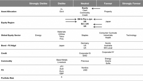 Several of our macro concerns will also impact European credit. The European banking system and regulatory change remain worries, but further policy stimulus and a limited supply in European area corporate bonds is delivering a powerful demand for high yield credit assets. European high yield also has more defensive characteristics than equities and offers better risk-adjusted returns with short duration. We are thus in favour of European high yield but our allocation to credit remains neutral.