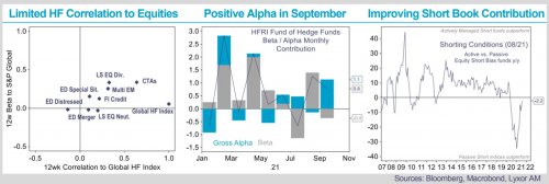 L/S Equity managers have decently navigated these markets, generating small positive alpha (especially on their short positions) but their implicit stance is diverging across regions. U.S. managers detracted only marginal alpha. They maintained their modest overall exposures throughout September and further reduced them early October, keeping limited factor tilts. They steadily reweighted the energy and rate-sensitive sectors, consistent with soaring energy prices and yields. Also, they just started to buy the dip on tech stocks that have corrected the most, as well as sectors negatively impacted by the pandemic. While they took profits on financials, they did not add much on defensive stocks. U.S. managers do not appear to be overly concerned by the macro backdrop, but higher tail risks, especially in the U.S., keep them in wait-and-see mode. Meanwhile, they are increasingly turning tactical and opportunistic.
