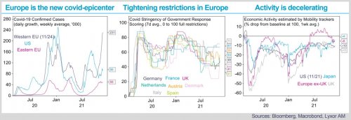 Surging Covid cases in EU and in the U.S. to some extent. Since October, Covid cases have been surging in Northern Europe and the virus is now spreading more broadly on the continent. The declining immunity provided by vaccines after 6 months and seasonality are suspected to be key factors. Countries such as Germany, Denmark, Austria reinstated tighter restrictions and might be followed by others. While broad lockdowns are seen as the last resort, tighter restrictions and a greater fear factor might delay the economic recovery, until this new covid wave is behind. Covid resurgence has been milder in the U.S. but cases might surge in the wake of Europe. The impact has been manageable so far, but high frequency data that track levels of activity are starting to decelerate on both sides of the Atlantic.
