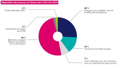 d’énergie renouvelable et des moyens de transport et de mobilité à faibles émissions de CO2- pour atteindre 20 Md€ d’ici fin 2023, contre 10,4 Md€ à fin 2018. A fin 2019, ces investissements verts atteignent 14,4 Md€ : 49 % concernent les bâtiments durables, 26 % les énergies renouvelables et l’efficacité énergétique, et 14 % le transport et la mobilité durable.