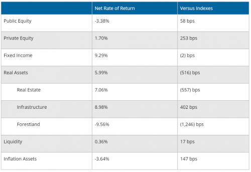 Fixed Income earned a 9.29 percent return, nearly matching its benchmark. Infrastructure delivered an 8.98 percent return, outperforming its benchmark by 4.02 percentage points, or 402 basis points. A basis point is one one-hundredth of a percentage point.
