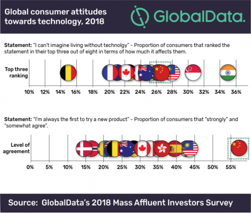 An analysis of GlobalData’s 2018 Mass Affluent Investors Survey shows that more than a quarter of the total 1,000 respondents ranked the statement ‘I can’t imagine living without technology’ within their top three, meaning only a few countries in the world place greater importance on technology. Meanwhile 57.3% of Chinese investors state that they are ‘always the first to try a new product,’ making them more open to new business models.