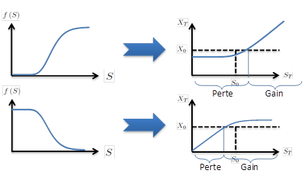 En suivant le raisonnement esquissé plus haut, on voit que les stratégies achetant quand le marché monte génèreront des profils convexes alors que celles vendant quant le marché montent génèreront des profils concaves. Les profils concaves ont comme caractéristique de perdre de plus en plus au fur et à mesure que le marché baisse ce qui explique leur dangerosité potentielle. En revanche, si la probabilité pour que le sous-jacent monte ou baisse est de 50%, la concavité du profil entraine que la probabilité de gain sera supérieure à 50%, comme on peut s’en faire une idée sur le schéma ci-dessous.