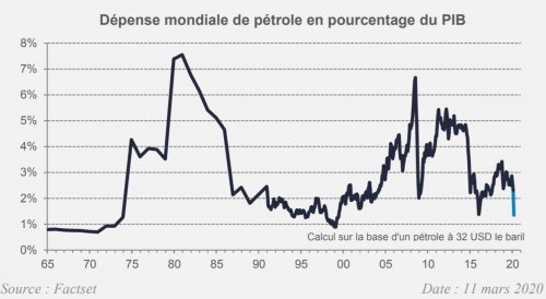 Sur la question de l’impact économique, la réponse dépend de l’horizon et de la pérennité de ce changement de prix. S’il semble durable, les compagnies pétrolières vont probablement revoir à la baisse leurs investissements. Après un sommet en 2014 à plus de 1000 mds USD, les investissements du secteur n’avaient pas redécollé depuis la forte baisse de 2015-2016. Mais à 600 Mds, ils représentent encore 0,7% du PIB mondial. Une division par deux sur un an représenterait donc un choc négatif de 0,3-0,4% de croissance.