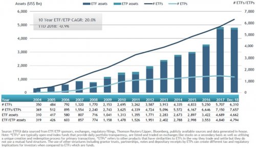 À la fin de décembre 2018, l’industrie comptait 7 657 ETFs / ETPs au niveau mondial, à travers 14 993 listings sur 71 bourses dans 57 pays provenant de 401 fournisseurs différents, pour un encours global de 4 790 milliards de dollars.