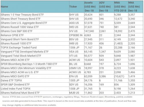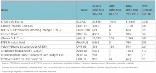 The top 10 ETPs by net new assets collectively gathered $3.84 Bn by the end of December 2018.