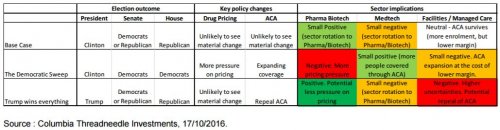 En cas de victoire de Trump à la Maison-Blanche et aux deux chambres du Congrès, les secteurs de la pharmacie et de la biotechnologie devraient surperformer, tandis que les hôpitaux pâtiront sans doute des incertitudes accrues concernant une annulation de l’ACA.