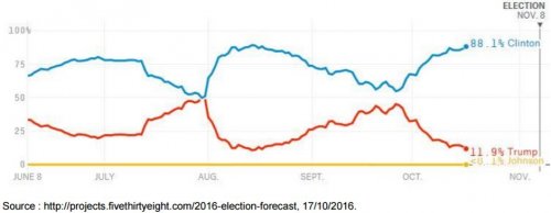Cependant, une victoire de Donald Trump est toujours possible et ne devrait pas être écartée. Les Etats-Unis restent ainsi un pays profondément divisé. Mme Clinton, personnage très peu apprécié, dispose par ailleurs d’une part d’opinions favorables médiocre (au deuxième rang des cotes les plus mauvaises de l’histoire, juste derrière Trump).