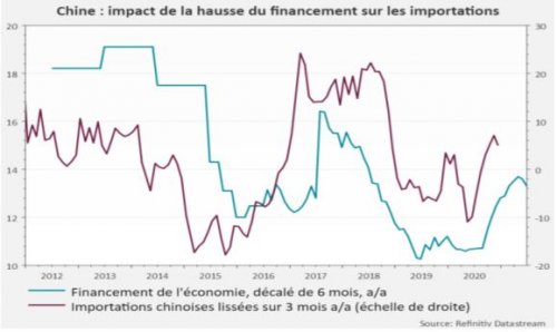 En effet, les données chinoises sont très intéressantes. L’activité en Chine a été soutenue en décembre, permettant de finir l’année 2020 sur un PIB en hausse de 6,5% sur un an, niveau inespéré après le choc du 1er trimestre connu par la Chine. Au total, le PIB aura cru de 2,3% sur l’ensemble de l’année, la Chine étant vraisemblablement le seul pays du G20 en croissance positive en 2020. Le rebond est surtout lié au secteur industriel particulièrement dynamique en fin d’année, avec une production en hausse de 7,3% sur un an. La demande extérieure adressée à la Chine reste très vigoureuse. La Chine a littéralement inondé le monde des produits dits « covid » (masques, équipements médicaux mais aussi ordinateurs…) alors même que le premier confinement avait fermé ou désorganisé le tissu industriel mondial. A la fin de 2020, le taux d’utilisation des capacités industrielles a globalement largement récupéré son niveau d’avant crise à 78%, avec certes encore de fortes disparités sectorielles.