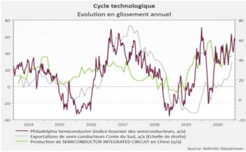 La proximité géographique et une plus grande intégration commerciale d’une part mais aussi, et cela a son importance, une meilleure gestion de la crise sanitaire a fait de ces marchés boursiers asiatiques les premiers à rebondir si l’on exclut bien entendu les économies les plus sensibles au tourisme et transport (Thaïlande, Malaisie et Philippines) mais aussi l’Inde. Une spécialisation industrielle sur les semi-conducteurs et plus généralement le secteur de la haute technologie a été un moteur supplémentaire, comme à Taiwan ou en Corée du Sud. Compte tenu de la dynamique de la demande chinoise sur ce secteur spécifique et des priorités politiques affichées en la matière, la tendance pourrait encore perdurer quelques temps.