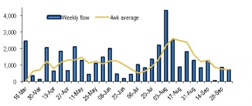 According to BofA Merrill Lynch Global Research report, fund flows data reveal that inflows into high-grade funds have slowed down over the past few weeks. Chart 1 indicates that the four-week average trend has decelerated to its lowest point since mid-July.