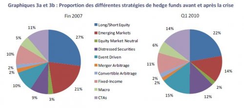 Les gérants Long/Short Equity ont en effet vu leurs encours sous gestion diminuer de plus de 30% entre fin 2007 et le premier trimestre 2010, réduction essentiellement imputable à des décisions d’allocation, l’effet performance que nous estimons étant nul sur cette période. Le constat est similaire pour les fonds Equity Market Neutral et Emerging Markets, sachant que pour ces derniers (-46%), un effet performance est également à prendre en compte (de l’ordre de -10%).