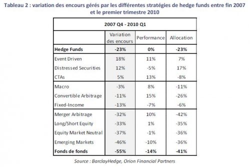 La dernière ligne de ce tableau illustre traduit également la remise en question du modèle des fonds de fonds. Alors que les encours gérés par les hedge funds ont reculé de 23% entre 2007 et Q1 2010, les encours détenus par les multigérants alternatifs ont diminué de 55%